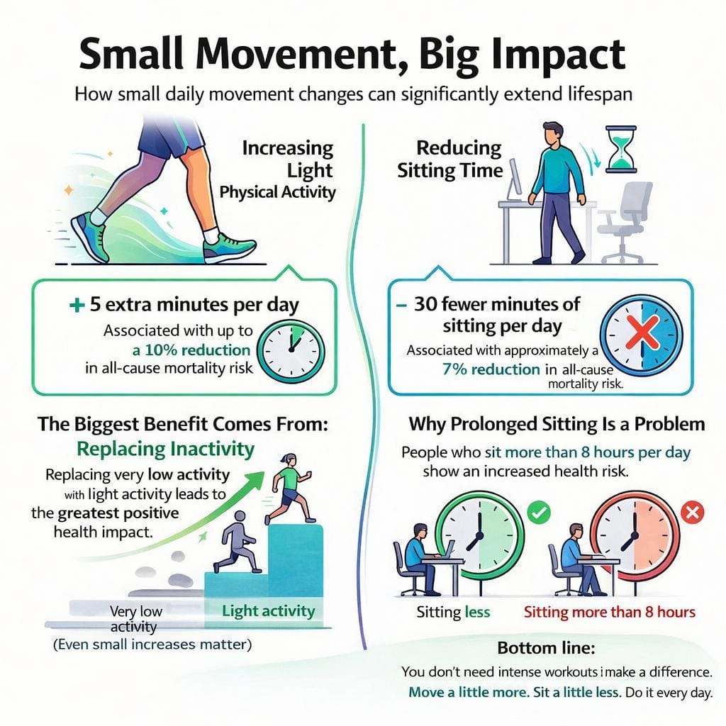 • Even very gentle movement — such as slow walking, standing, or light household activity — was associated with meaningful reductions in mortality risk.